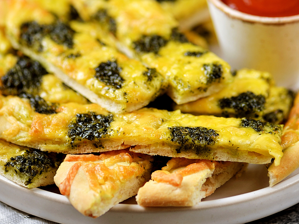 Основу этого блюда составляют три главных ингредиента: плавкий сыр, ароматное песто и тесто, схожее с пиццей. Сыр выбирается такой, который растопится до нежной консистенции — отлично подойдут гауда, маасдам или сулугуни. Песто можно использовать как покупной, так и домашний — в зависимости от вашей кулинарной экспертизы и настроения.