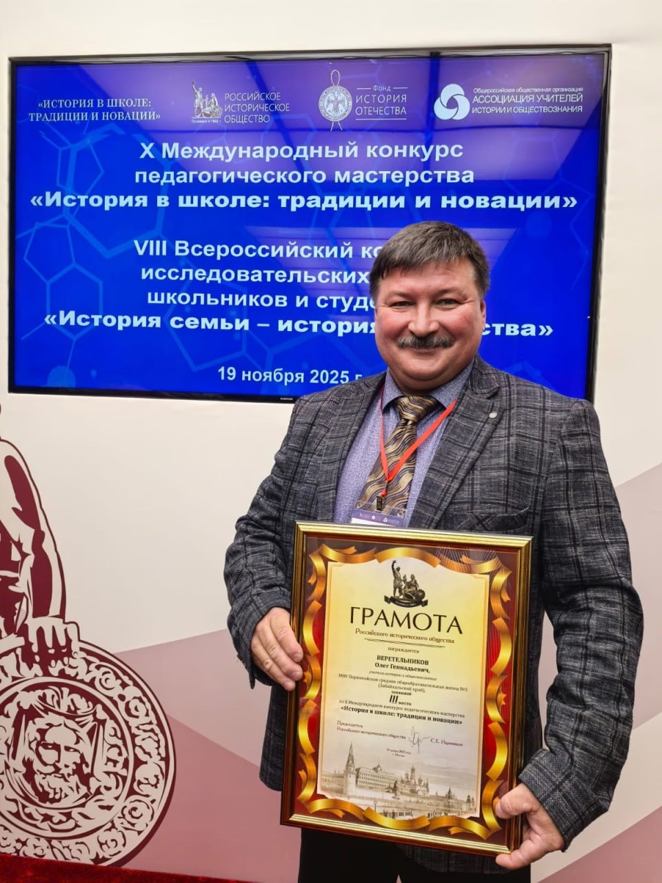 Олег Веретельников, учитель истории Первомайской СОШ №5, продемонстрировал свои умения и навыки преподавания «трудных вопросов» отечественной истории школьникам, по которым в научной среде нет единого мнения. Ему вручили грамоту Российского исторического общества и денежный приз.