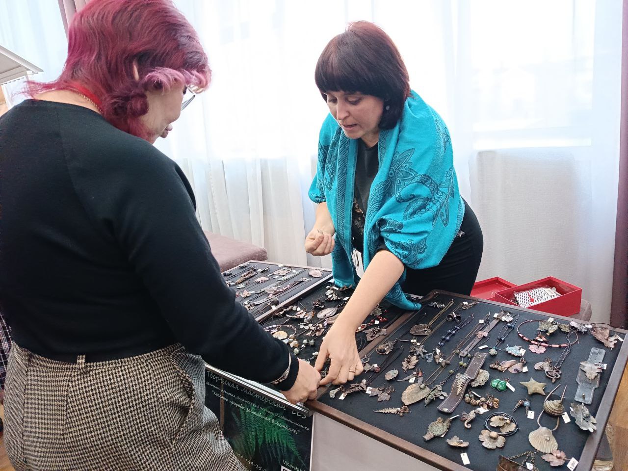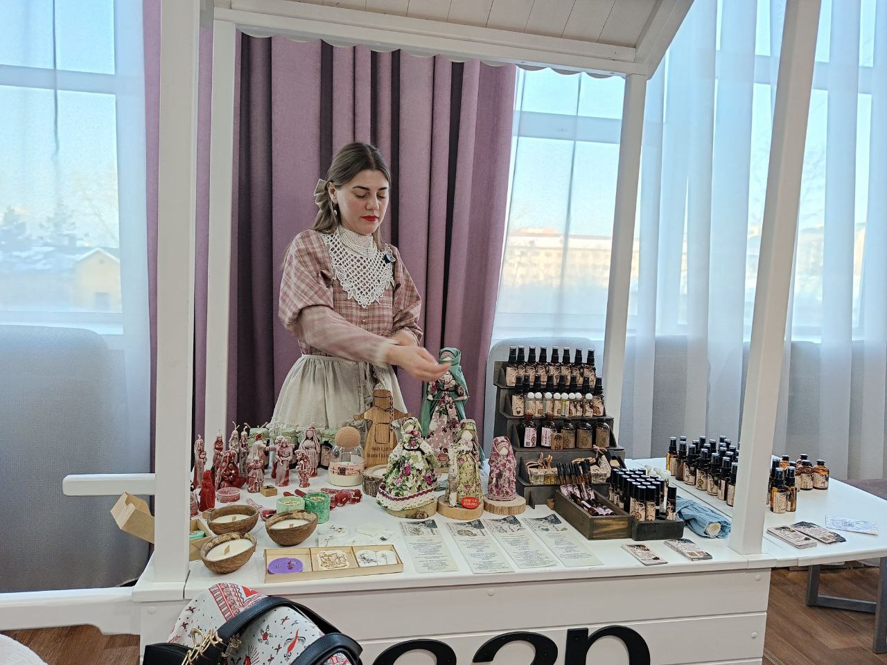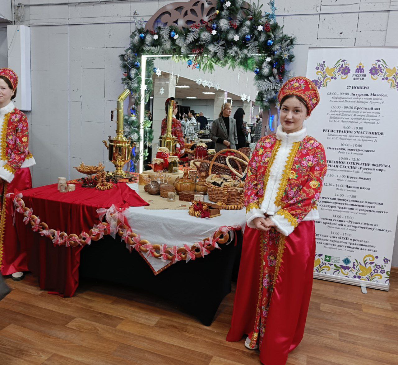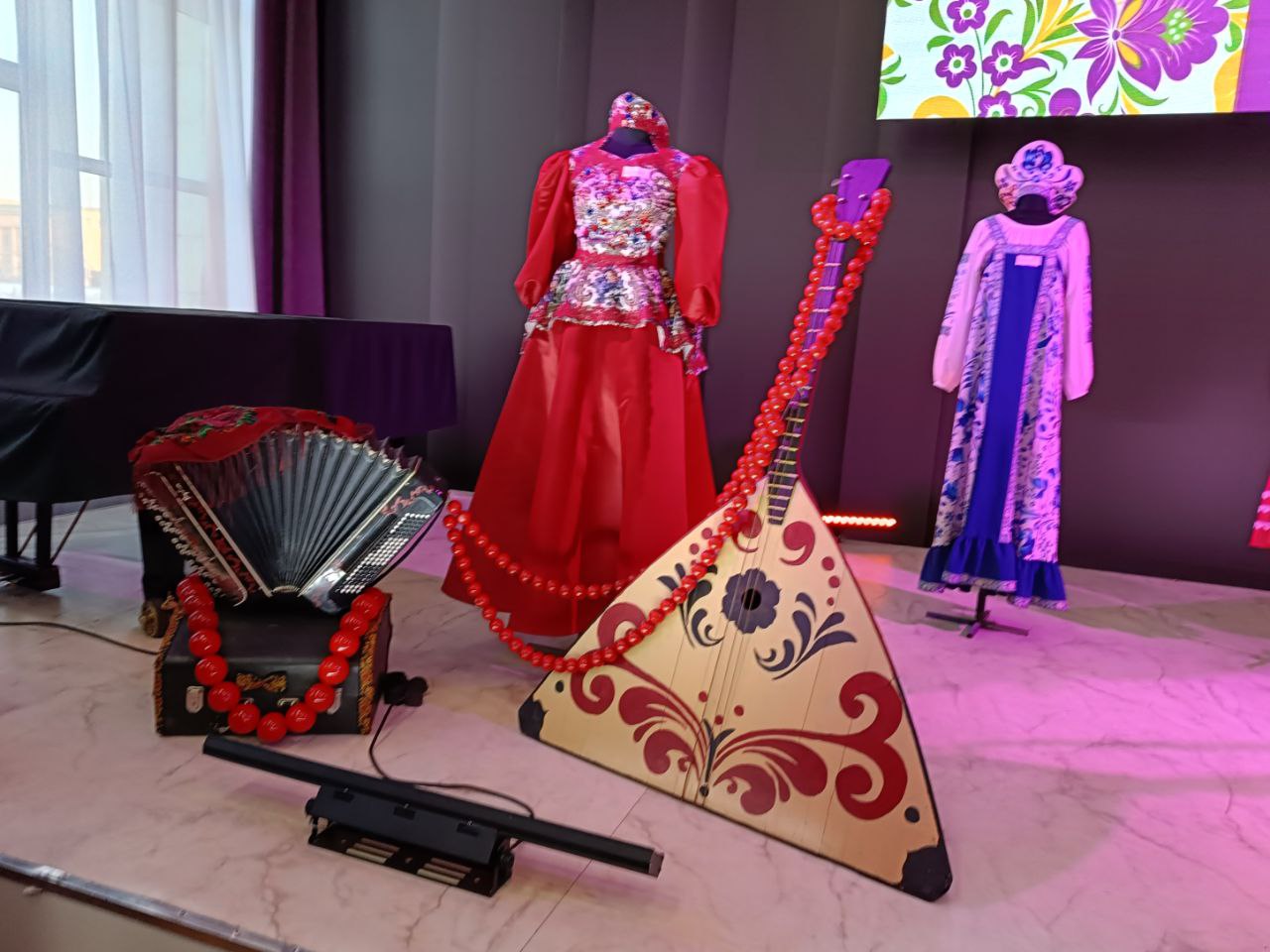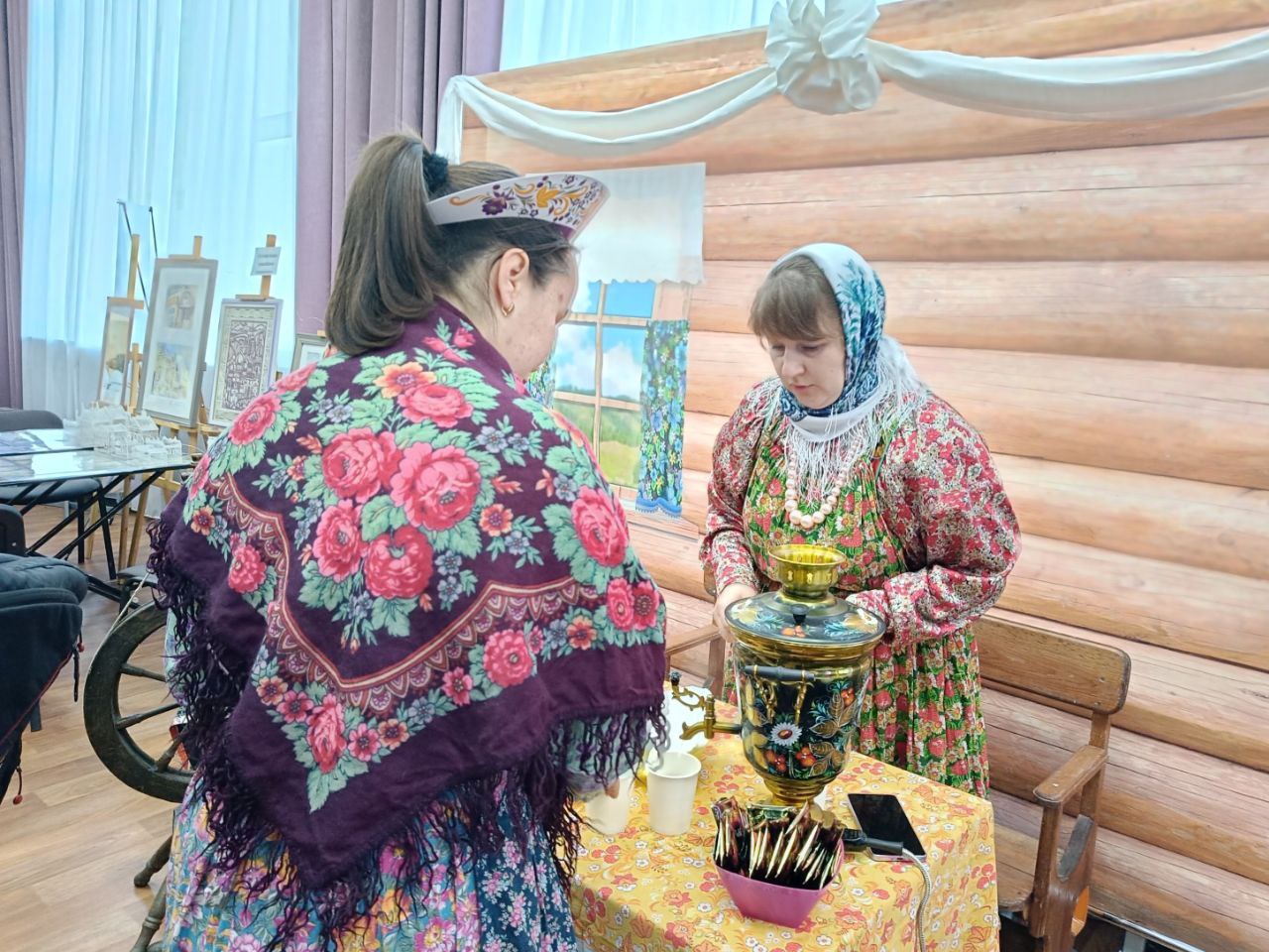 В фойе развернулась большая выставка: здесь можно увидеть изделия народных промыслов, национальную одежду и коллекцию русских народных сказок. Также организаторы накрыли праздничный стол.