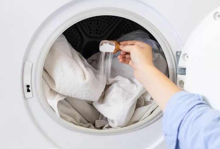 - Пищевая сода: Все известного средства можно по праву назвать универсальным помощником, который справляется с неприятными запахами и восстанавливает цвет белого белья. Две столовые ложки прямо перед стиркой сделают чудеса!