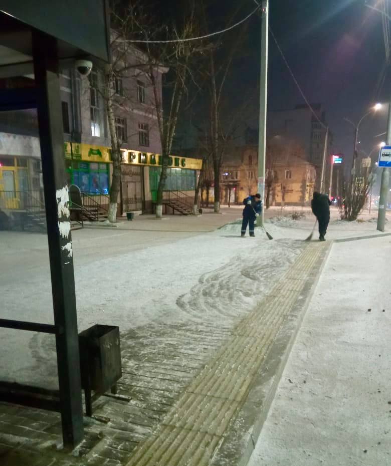 Подрядными организациями администрации города Читы минувшей ночью были очищены остановки и подходы к пешеходным переходам на улице Бутина, велось мехподметание на участках улиц Петровской, Бутина, Ленина, Ленинградской, Чайковского, Амурской, Чкалова, Журавлева. Автогрейдером велась очистка проезжей части участков улиц Кислородной, Кочеткова, Матвеева, Ангарской. На тротуарах улицы Ленина от Богомягкова до Бутина, улицы Бутина от Лермонтова до Чкалова производилось мехподметание. Механизированная посыпка осуществлялась на участках 20 улиц, в результате которой высыпали 71 кубометр противогололедных материалов.