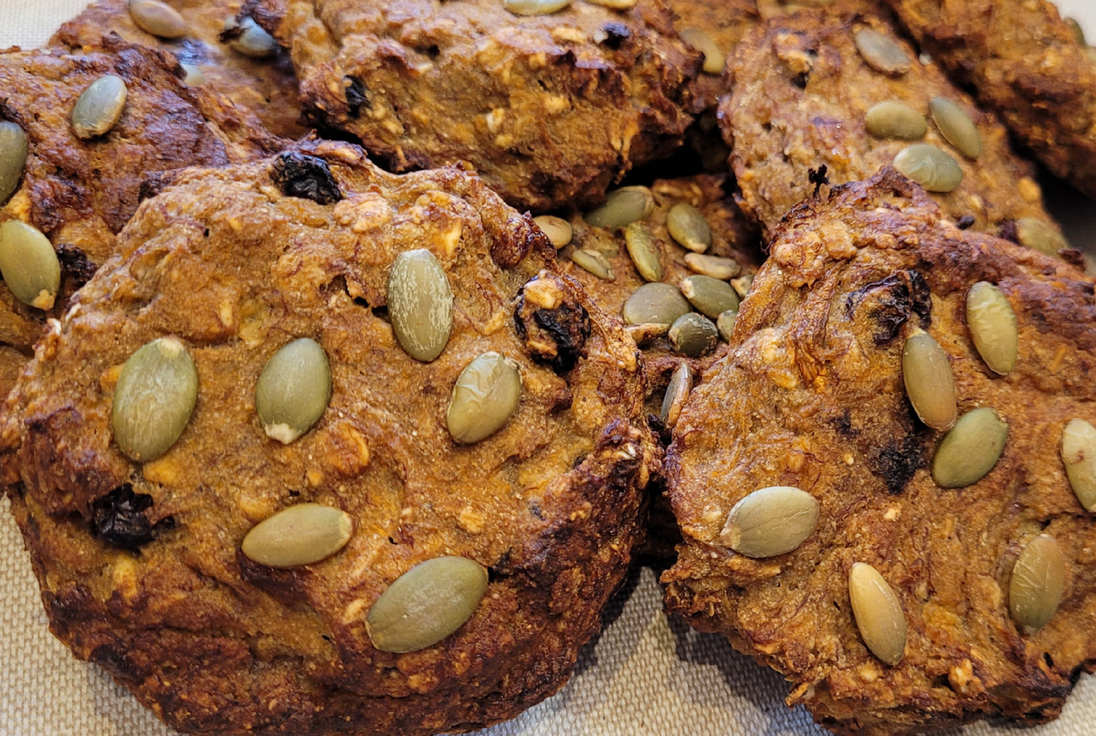 После этого, ложкой выкладываются порции теста на противень, выстланный пергаментом. Каждый кусочек можно посыпать тыквенными семечками — это добавит не только текстуру, но и эстетику.