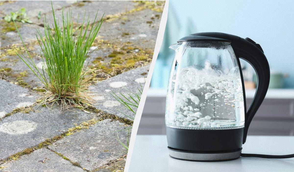 - Кипяток — отличное решение для удаления сорняков. Он подходит для всех типов трав и безопасен для плиточного покрытия.