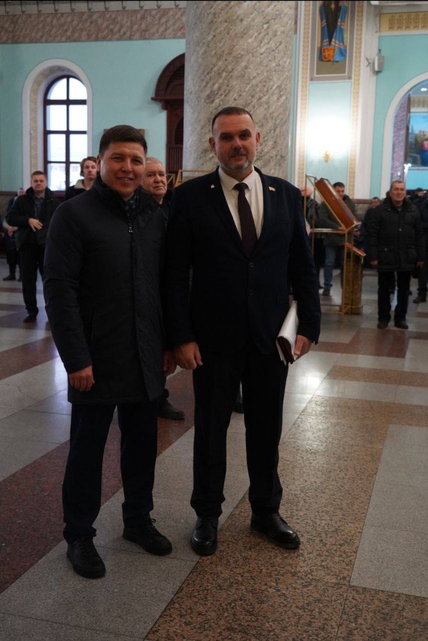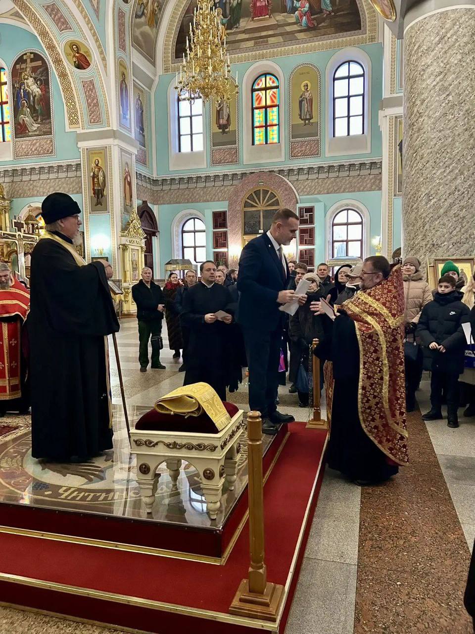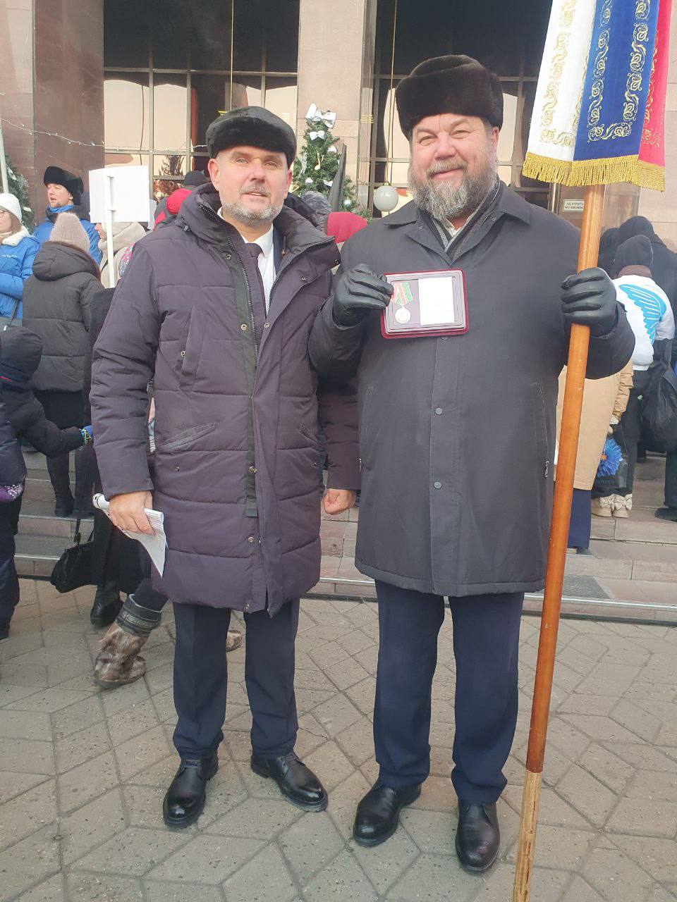 На утренней службе в Кафедральном Соборе Казанской иконы Божьей Матери с Благословения Митрополита Читинского и Петровск-Забайкальского Димитрия депутаты гордумы Виталий Козак и Евгений Сажин вручили медали Священнослужителям Протоерею Михаилу Андрусю и Олегу Иванину.