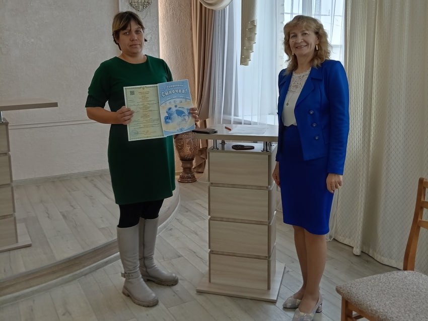 Заведующий отделом ЗАГС вручила Марии Николаевне первые государственные документы о рождении ребенка, поздравила семью с очередным счастливым событием в их жизни.