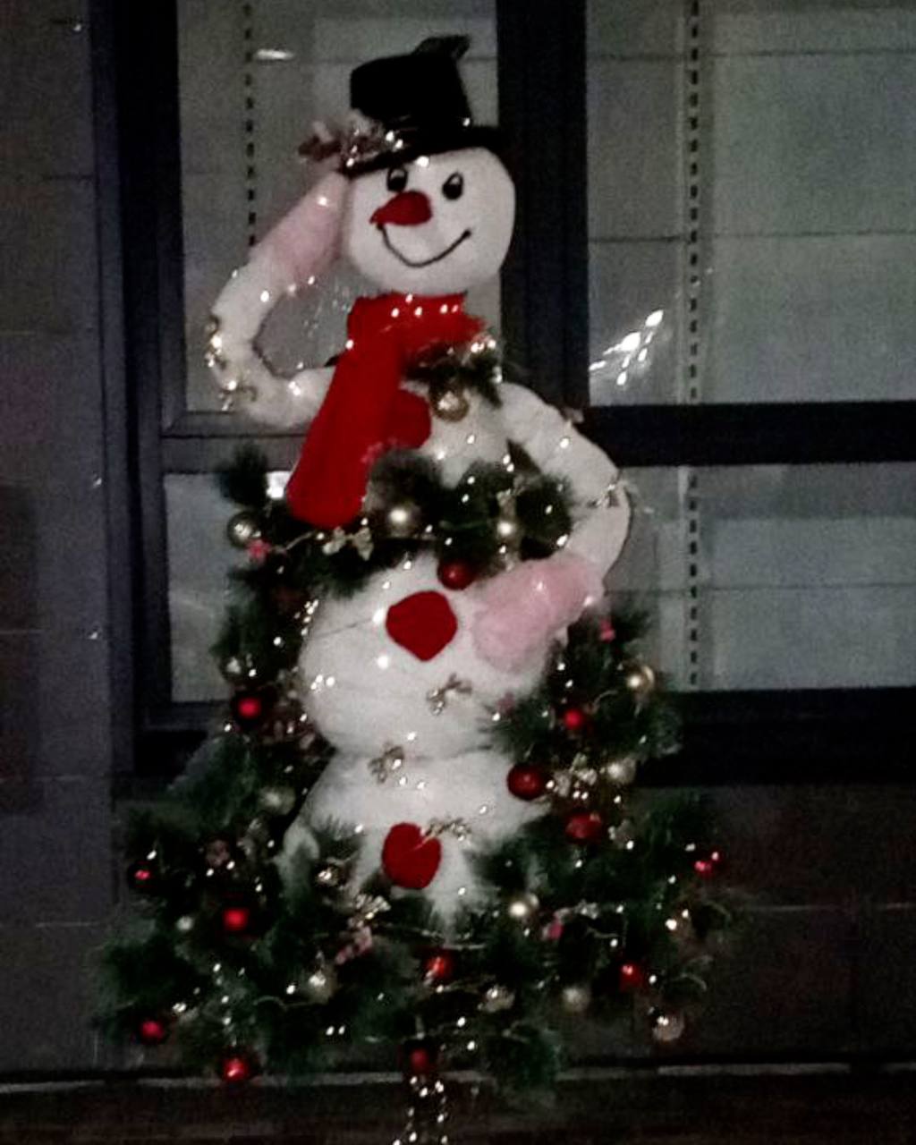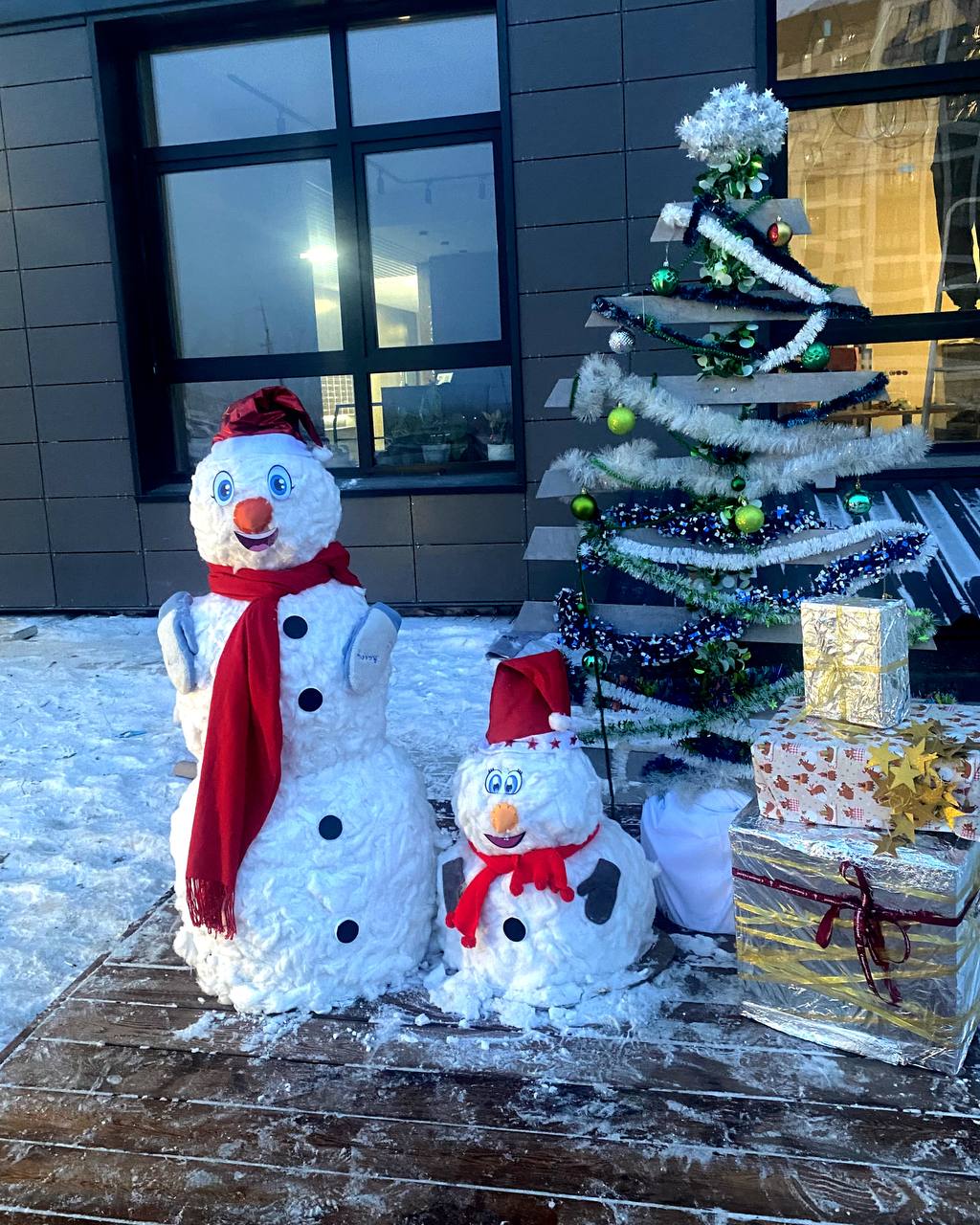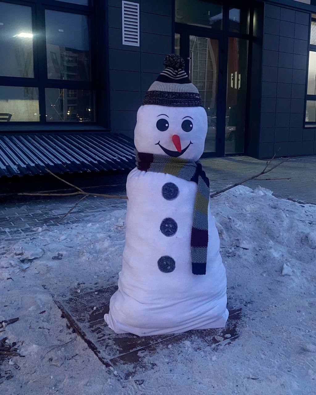 Например, у одного дома снеговик из мешков, у другого — из ваты, у третьего — из елки!