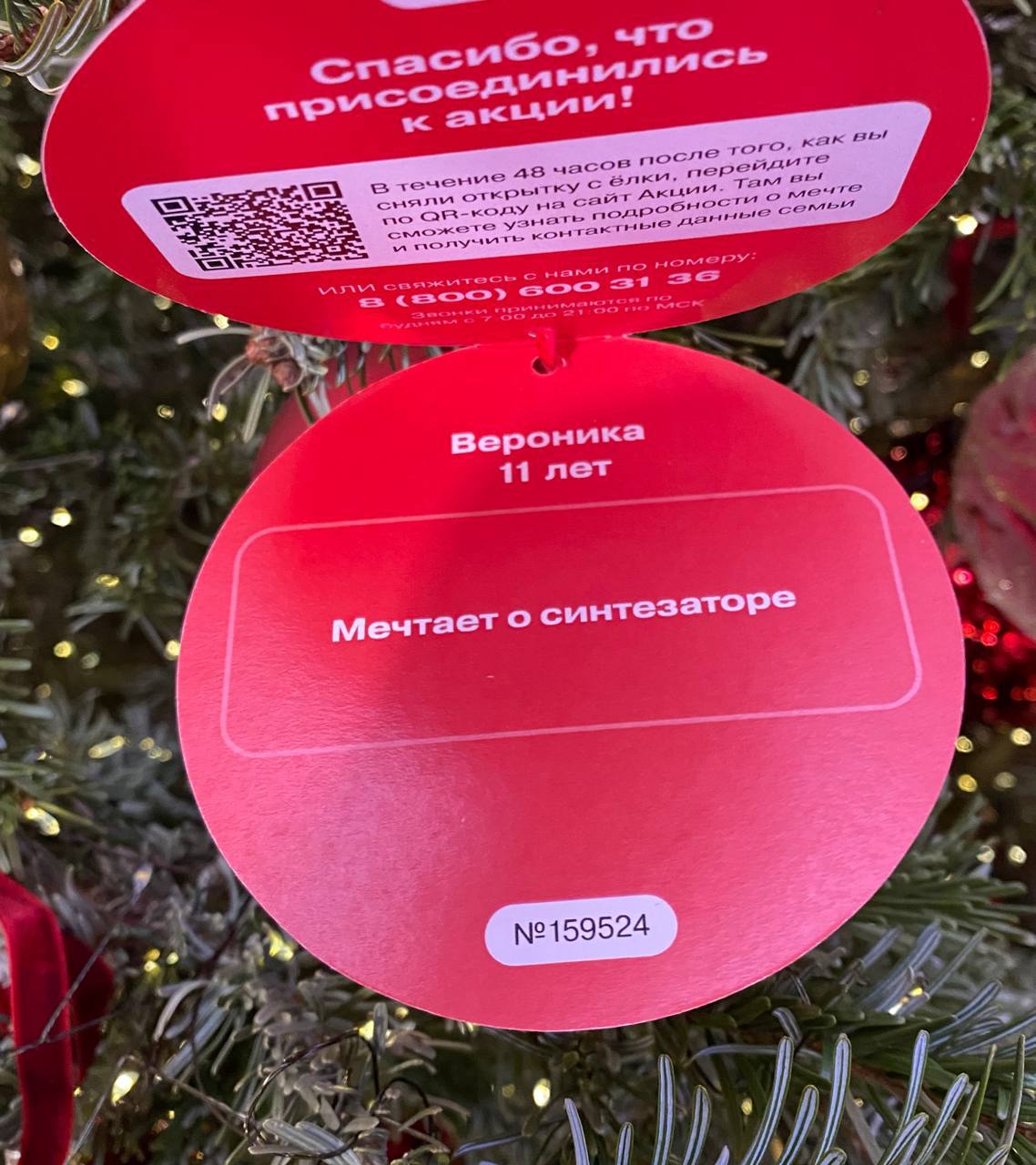 В этом году Баир Жамсуев снял с елки шар с желанием Вероники из Ононского района Забайкальского края. Вероника мечтает о синтезаторе, который поможет ей развивать свои музыкальные способности.