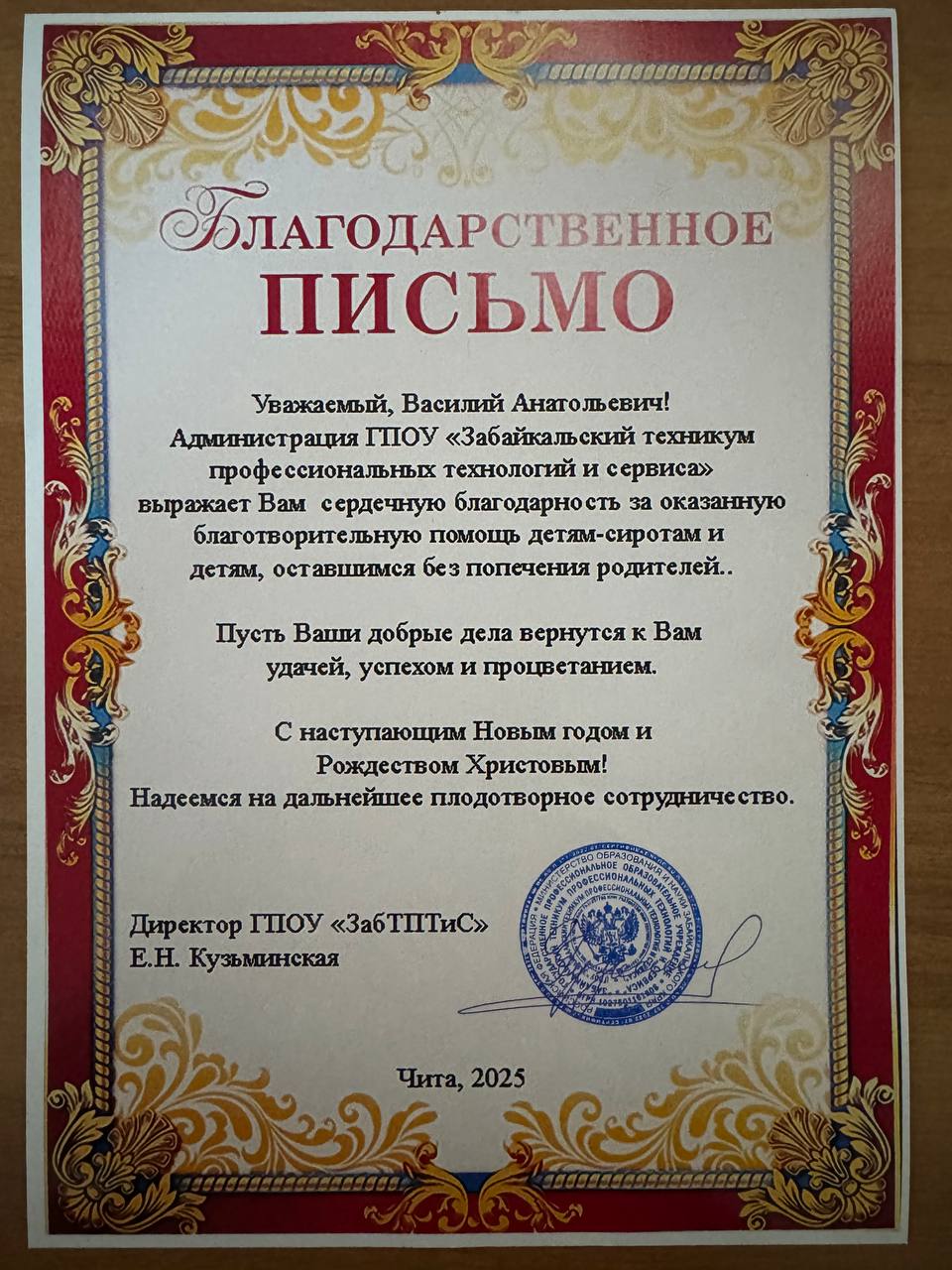 Главе района также было передано благодарственное письмо Забайкальского техникума профессиональных технологий и сервиса за помощь детям-сиротам и детям, оставшимся без попечения родителей.