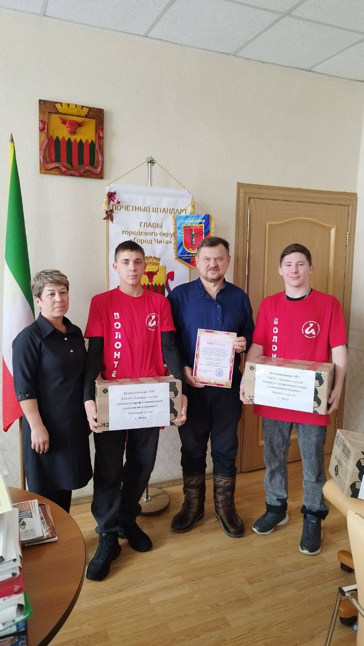 На днях Забайкальский техникум профессиональных технологий и сервиса передал штабу гуманитарной помощи Черновского района под руководством главы администрации Василия Турсабаева 130 окопных свечей и средства гигиены.