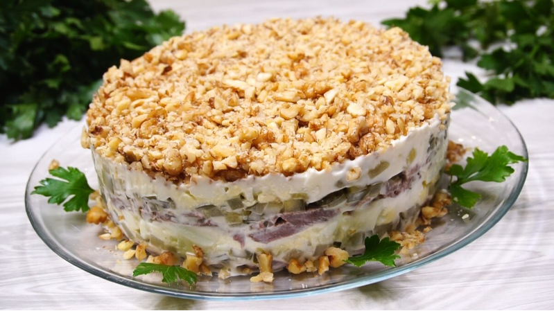 После сборки салат следует оставить в холодильнике на 2 часа для пропитывания, после чего аккуратно удалить кольцо. Теперь салат готов к подаче!