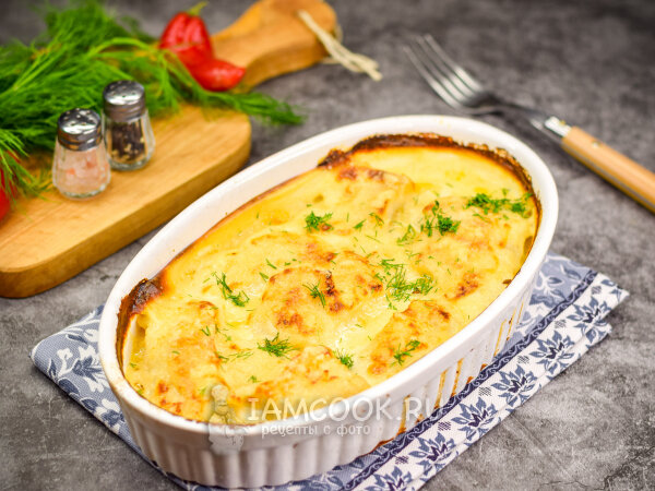 - Филе хека нарезать на кусочки и приправить солью и перцем. Уложить в предварительно смазанную маслом форму.
