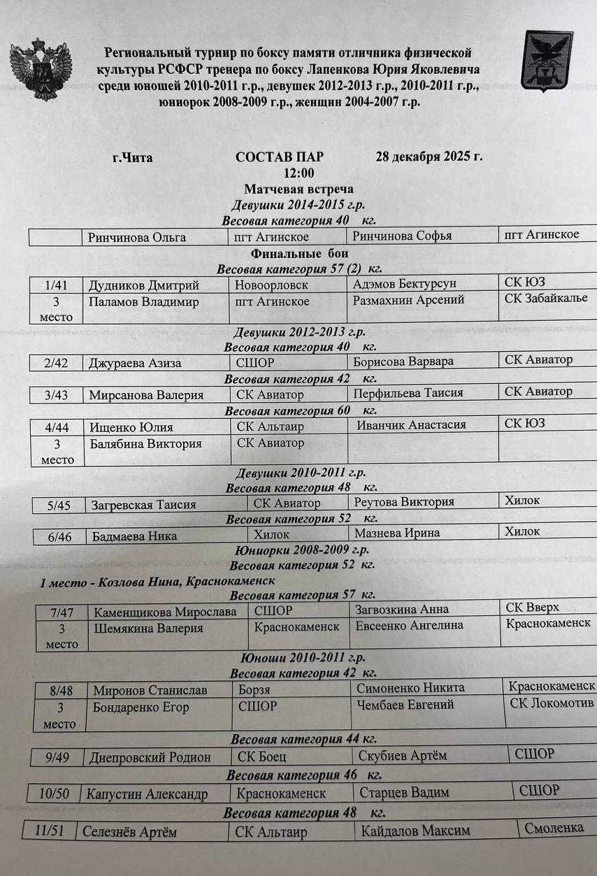 Состав пар на финал региональных соревнований по боксу среди юношей 2010-2011 г.р. и девушек всех возрастов к 90-летию со дня рождения Юрия Яковлевича Лапенкова