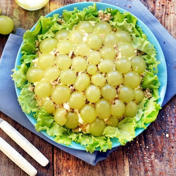 Завершите оформление салата, расположив половинки винограда по всей поверхности.