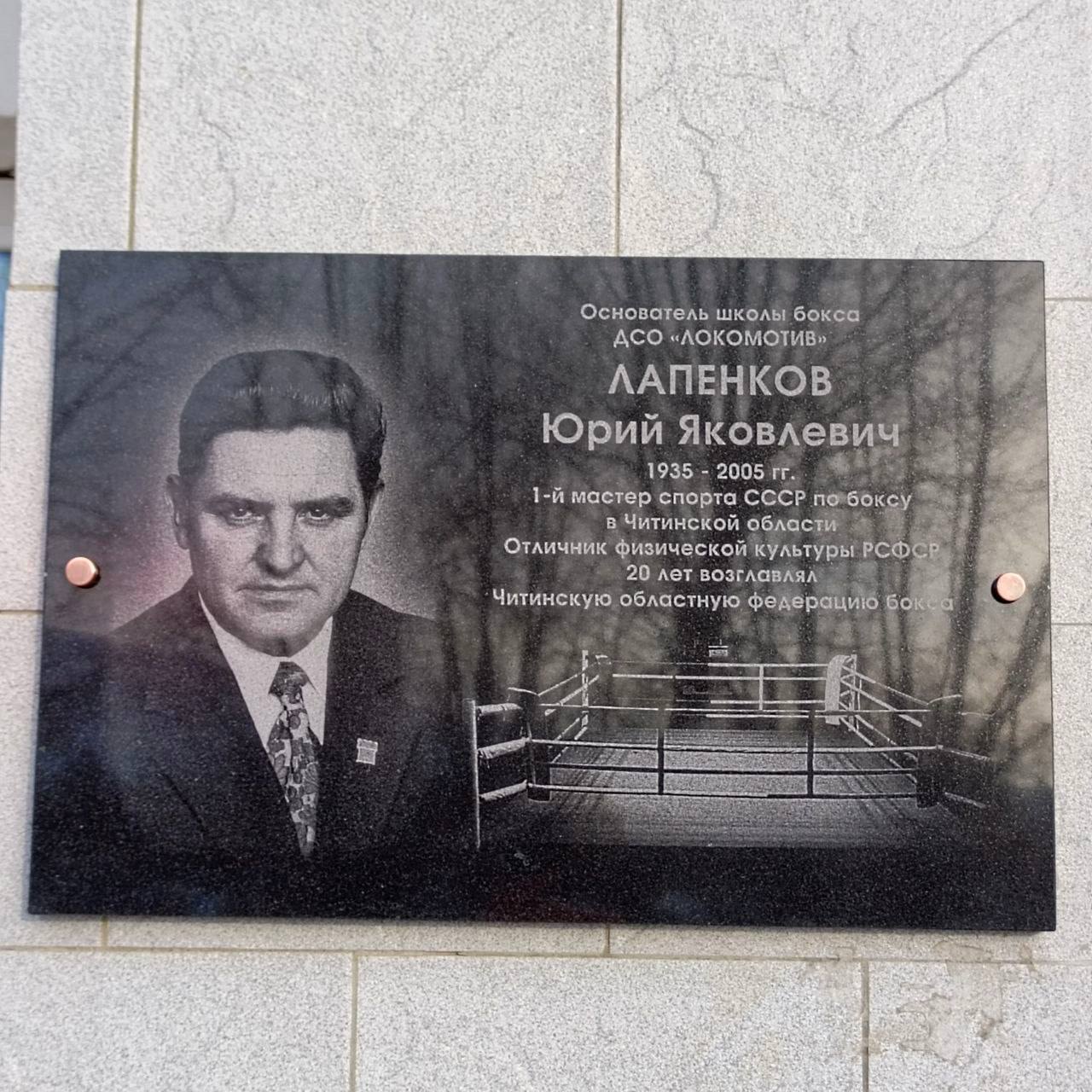 Сегодня в спортивном комплексе «Локомотив» прошло торжественное открытие памятной доски первому мастеру спорта СССР в Читинской области, отличнику физической культуры РСФСР. Тренеру, который воспитал более 12 мастеров спорта Юрию Яковлевичу Лапенкову