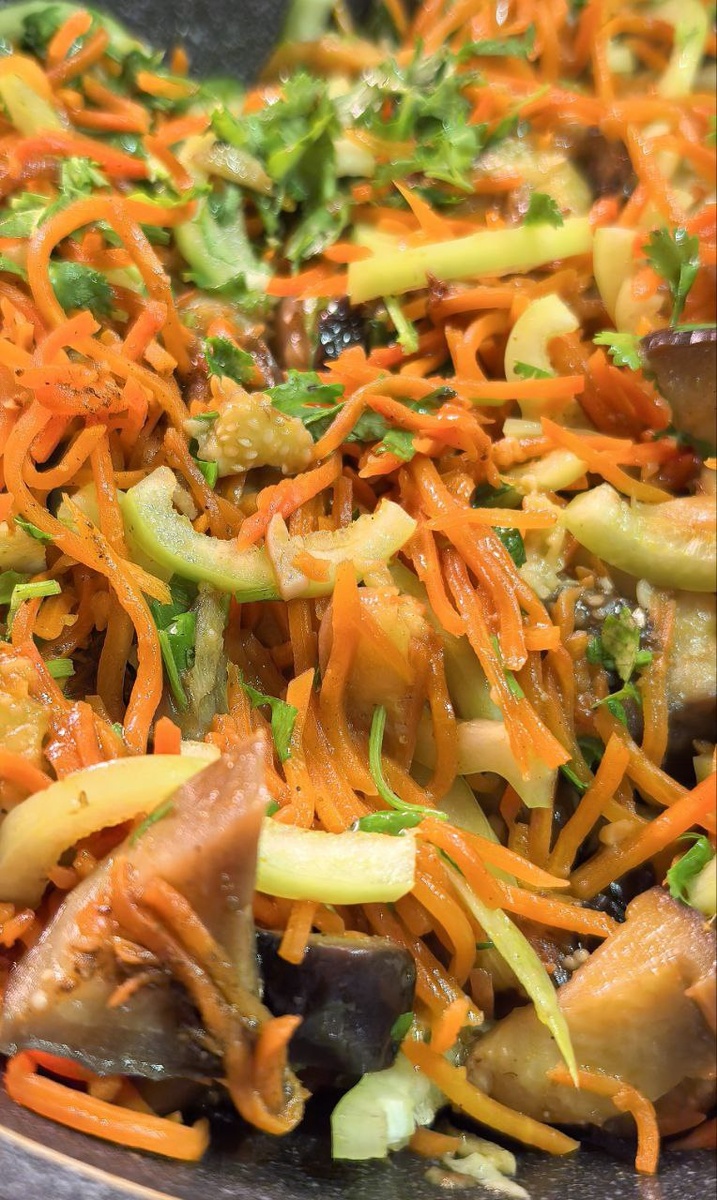 Приготовленное блюдо можно подавать как самостоятельное угощение, или с гарниром из риса, хлебом или даже как намазку. Сочетание нежного, мягкого баклажана с остротой корейской морковки и свежести перца создаст истинный праздник для вкусовых рецепторов.