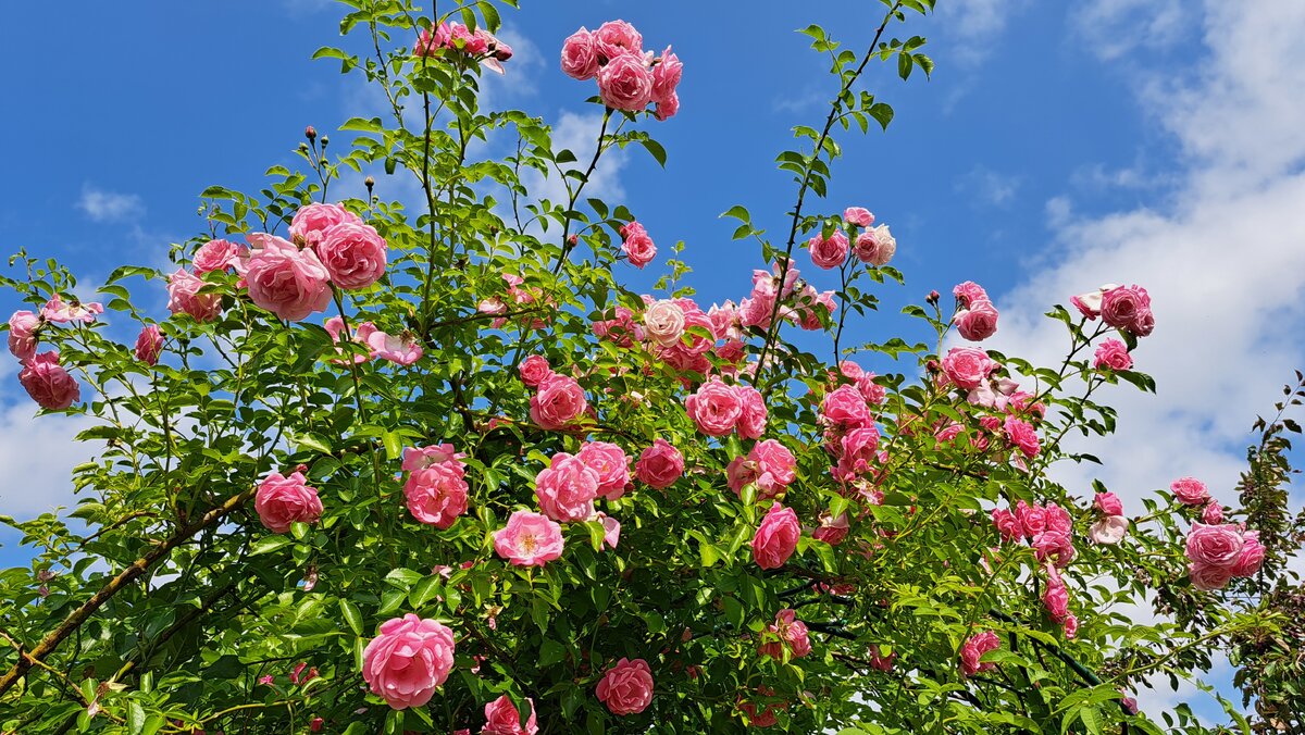 Плетистая роза 'Парад' выделяется длинными, гибкими побегами, достигающими 4 метров в длину, что делает ее идеальным кандидатом для оформления арок и беседок. Она появилась в результате скрещивания известных сортов - 'New Dawn' и 'World's Fair'. Цветы имеют чашевидную форму, до 10 см в диаметре, и раскрываются в насыщенных розовых тонах, которые светлеют к краям. Эти цветы изумительно переносят дожди, что делает их идеальной находкой для садоводов в дождливых местах.