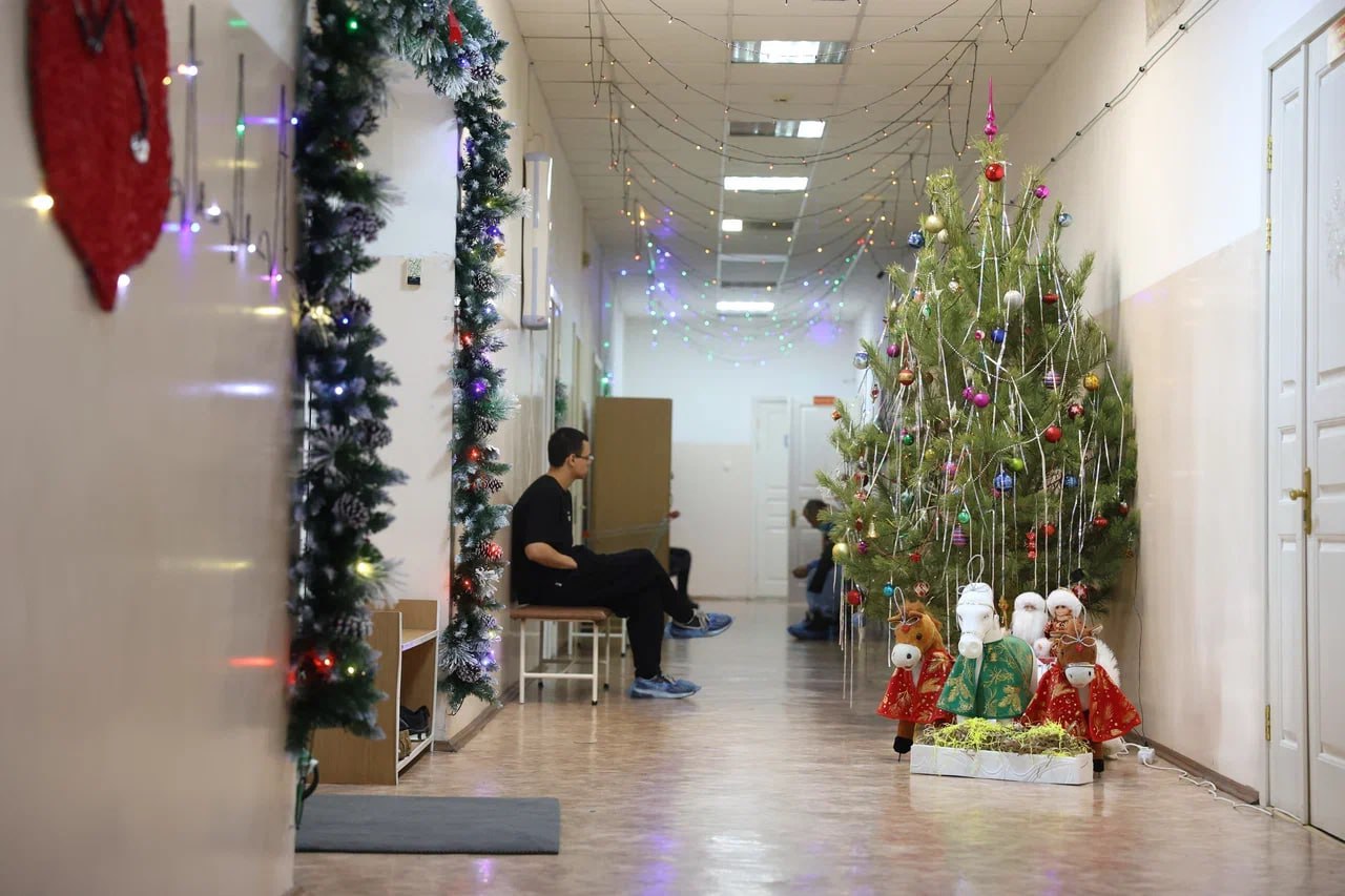 Кроме того, коридоры госпиталя украшены к Новому году — сделано множество инсталляций. Глава региона Александр Осипов отметил заботу персонала госпиталя.