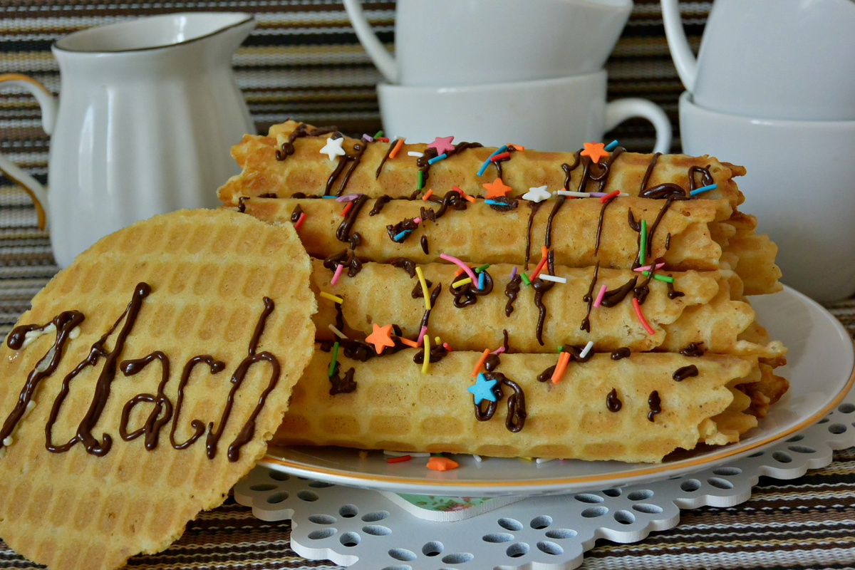 Просто и быстро: готовя это тесто, его следует выпекать в вафельнице, после чего аккуратно сворачивать в трубочки. Как завершающий штрих, не забудьте об украшении – растопленный шоколад и яркая посыпка добавят нотку изысканности.