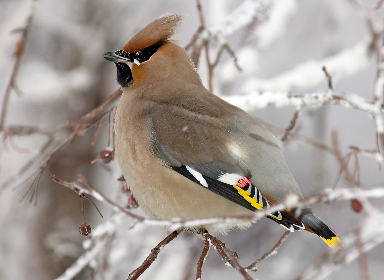 В нарядной шубе, с бородой, ярких. Это – свиристель Bombycilla garrulus. Необычный факт из жизни птиц – они прилетают в регион зимой, как раз к Новому году.
