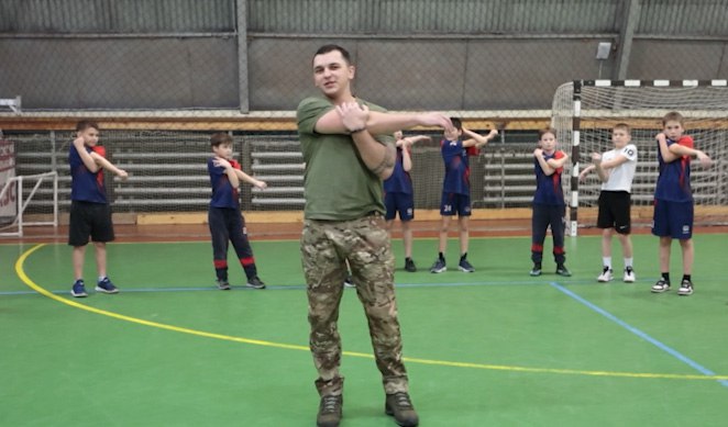 Во время тренировки забайкалец рассказывал юным спортсменам о своём пути, подчёркивая важность физической подготовки и работы в команде.