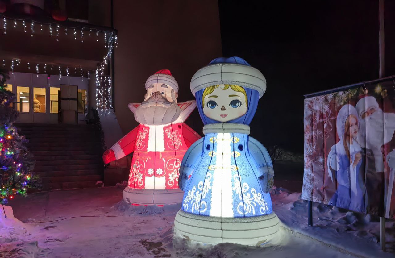 В Газимурском Заводе возле ёлки к администрации уютно расположились ростовые символы праздника - Дедушка Мороз со внучкой Снегурочкой, а рядом с ними снеговики в уютных шапках, шарфах и варежках.