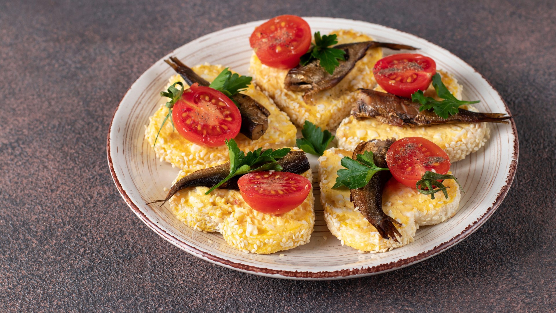 Картофельные ломтики нужно будет смазать сырным соусом и положить на них по одной рыбке. Нарежьте помидоры на кубики, убрав жидкую середину. И посыпьте ими бутерброды. Украсить творение можно свежей зеленью, передает портал «Женские секреты».