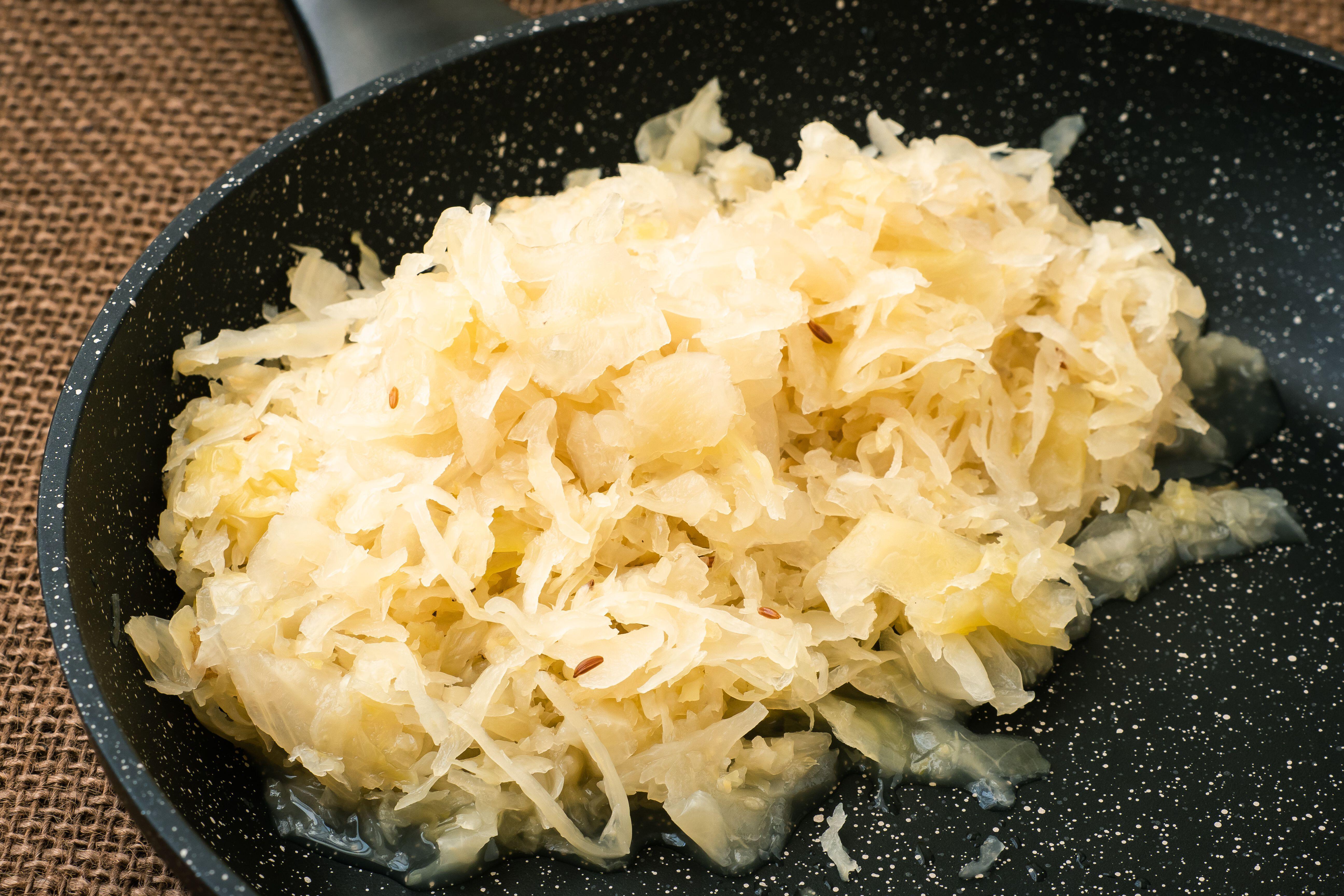 Разогрейте в глубокой сковороде растительное масло, потом положите в нее нашинкованную свежую капусту. Жарьте, постоянно помешивая. Добавьте к ней квашеную, предварительно отжав рассол.