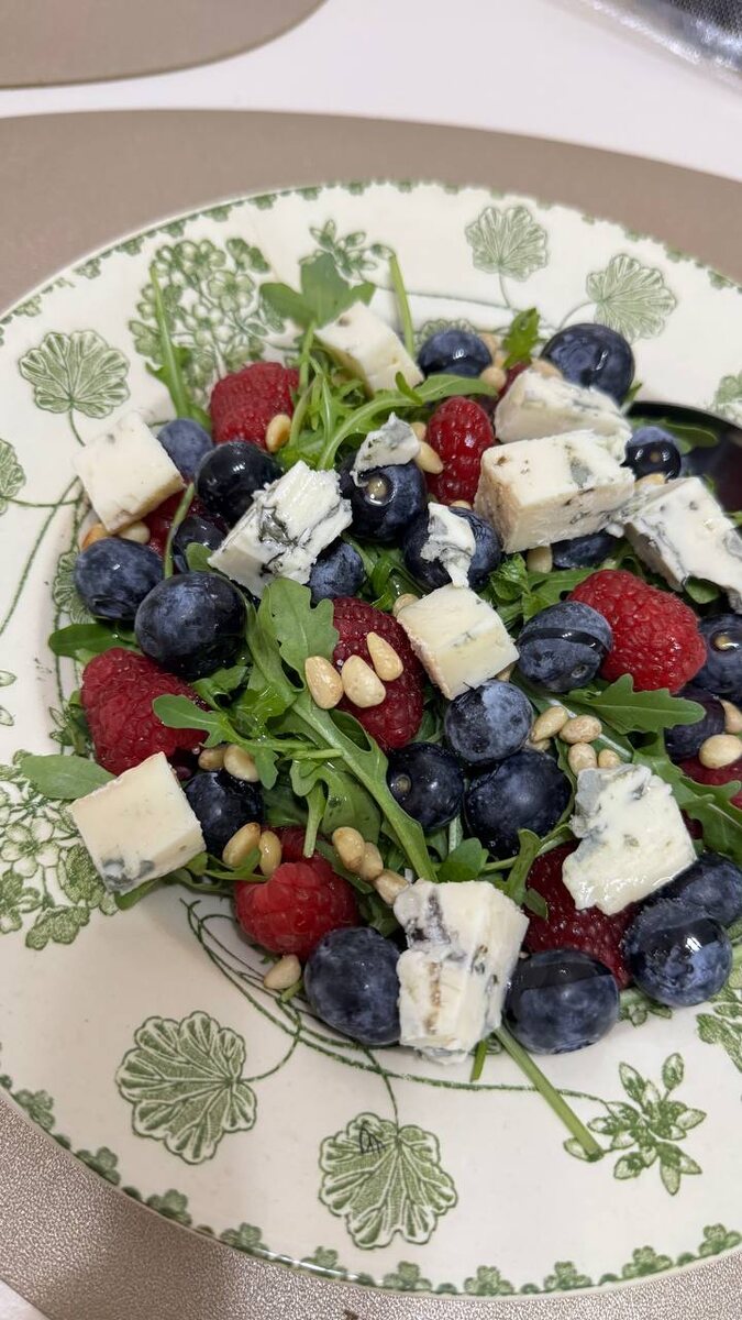 Такой обед не только радует глаз, но и способствует здоровью. Руккола известна своими антиоксидантными свойствами, а ягоды полны витаминов и минералов. Кедровые орешки обеспечивают нас протеинами и полезными жирами, в то время как сыр с голубой плесенью способен поддерживать баланс полезной флоры в организме.