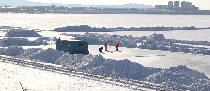 Работа кипит на льду озера. Опытные специалисты трудятся в парах, сменяя друг друга, чтобы не замёрзнуть. Толщина льда на водоёме большая, что гарантирует полную безопасность при проведении обряда, но и немалый объём работы.