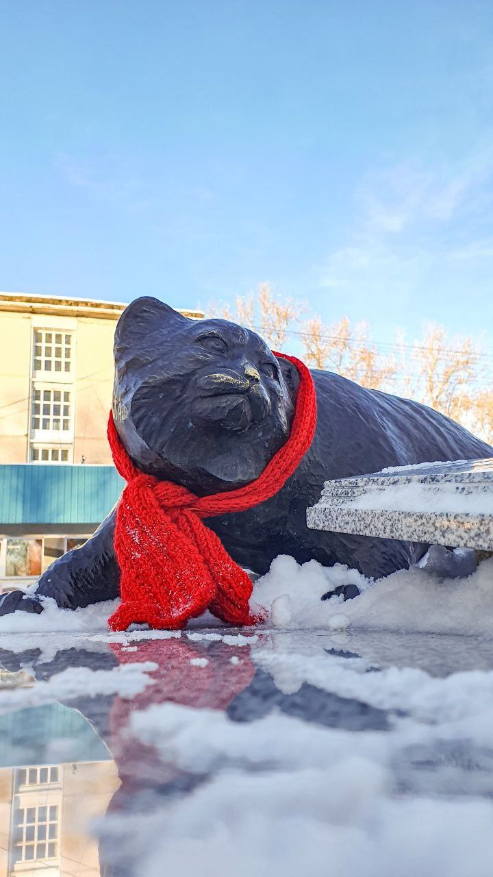 Каменных манула и сурков в Краснокаменске утеплили, повязав им красные шарфы.