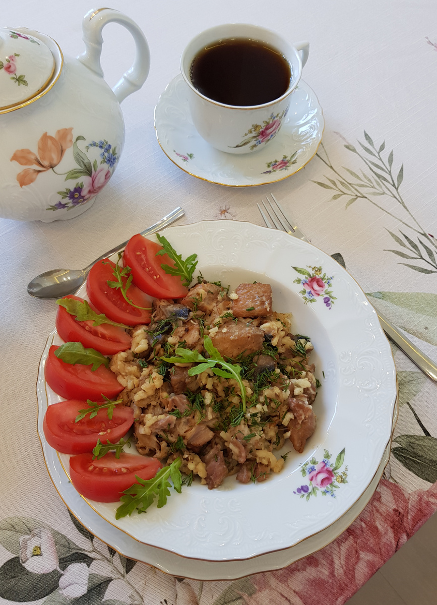 Теперь пришло время для главных героев блюда: в кастрюлю выкладываются грибы, также необходимо добавить плавленый сыр и тщательно перемешать до его полного растворения. Обычно не требуется добавлять воду, так как свинина и лук выделяют достаточно сока. Этот процесс тушения займет около 40 минут на медленном огне. В финале к мясной смеси добавляется промытый рис, который тушится еще 20 минут до готовности. Готовое блюдо перемешивают, чтобы рис впитал сливочный соус.