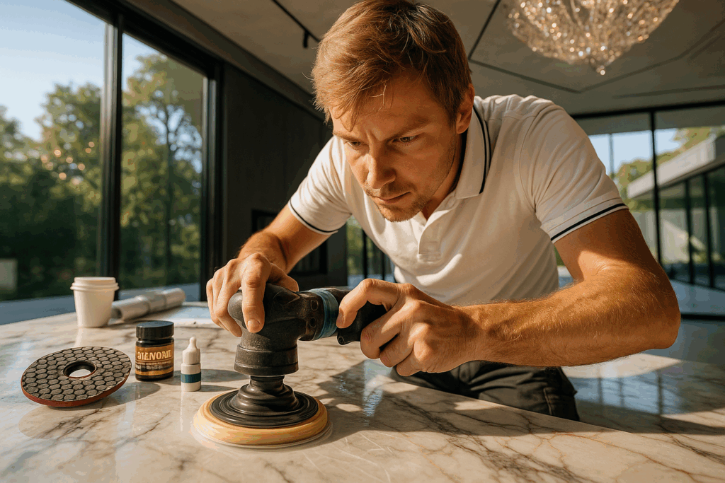 При неосторожном использовании ножа на столешнице из кварцита можно случайно оставить заметные царапины. Это распространенная проблема для дорогих квартир и ресторанов, где такие поверхности используются. Многие верят, что кварцит неуязвим, но реальность такова, что он подвержен повреждениям. Хорошая новость заключается в том, что восстановление возможно без полной замены столешницы, и это решение значительно экономнее.