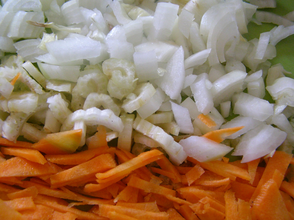 Ингредиенты: 200 г картошки, 70 г лука, 70 г моркови, 200 г капусты, консервированная фасоль.