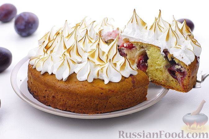 - Пирог на кефире со сливами и безе. Невероятное сочетание кислинки слив и сладости меренги делает этот пирог настоящим украшением стола.