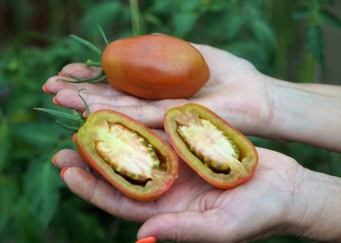 Сроки: 105–115 дней от всходов до первых плодов. Плоды грушевидной формы, массой 100–250 г, с неравномерной окраской и стабильной урожайностью в условиях тепличного выращивания. Для получения крупных кистей рекомендуется регулировать нагрузку на куст и поддерживать растение подвязанным к шпалере.