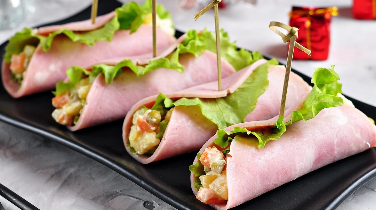 Сверкают огни и кажется, что времени на подготовку меньше, чем кажется. Такие маленькие рулетики из ветчины превращаются в заметную деталь стола за считанные минуты, а выбор начинок превращает каждый кусочек в маленькое событие.
