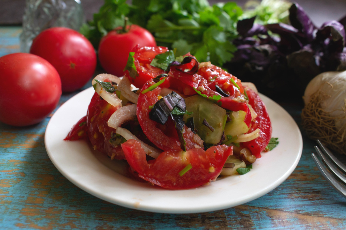 Этот салат объединяет сладкие помидоры и хрустящие огурцы, а зелень добавляет ярких акцентов. Можно регулировать количество овощей по настроению и времени года, а заправка из грецких орехов, чеснока и винного уксуса дарит характер и лёгкую пикантность.