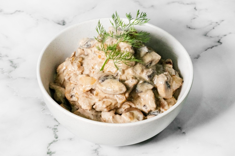 Пассируем лук с чесноком, добавляем грибы, затем вводим мясо. После быстрого обжаривания вливаем сливки, доводим до легкого кипения и снимаем с огня. Блюдо готово за считанные минуты и отлично сочетается с картофелем, рисом или пастой.
