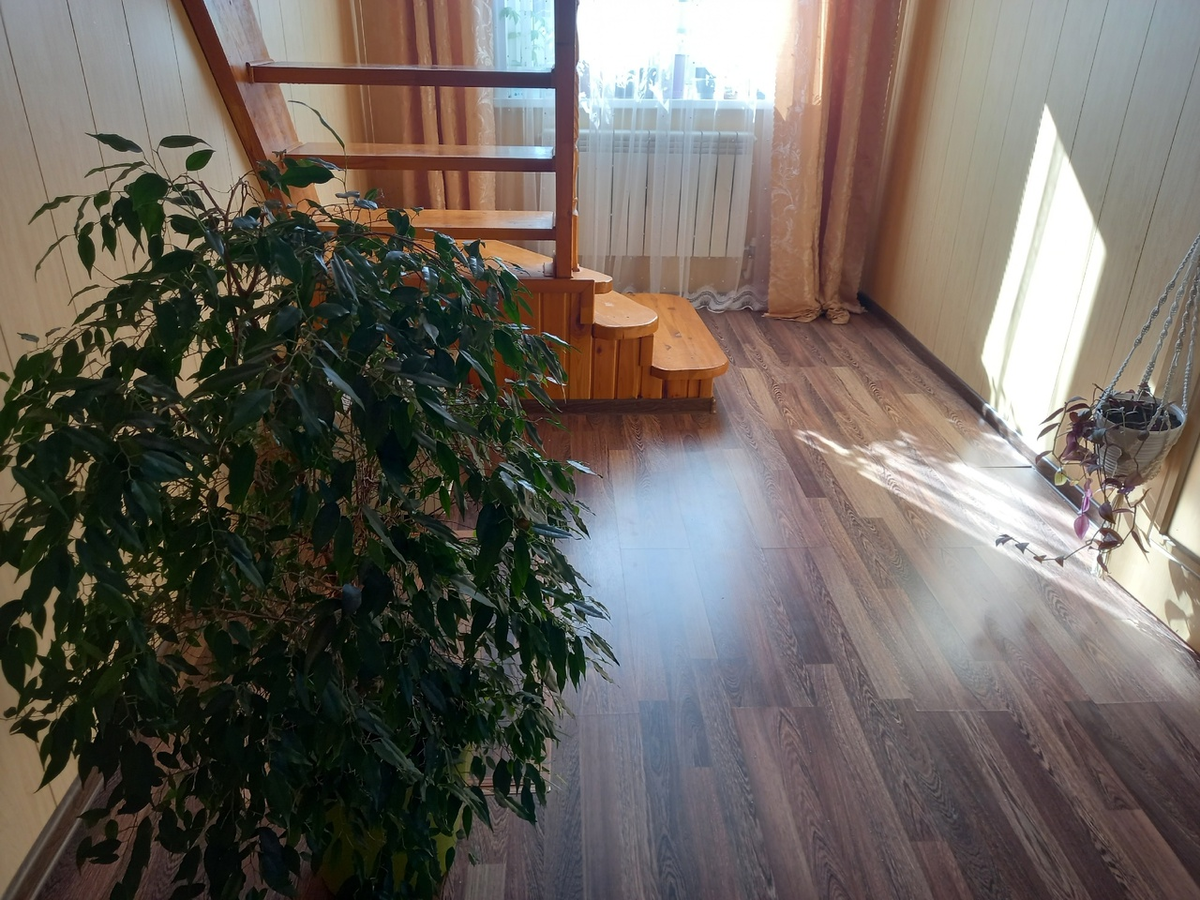 Балкон занимает большую площадь и служит настоящей мини-оранжереей. Здесь растут разнообразные растения: от фикуса Валеры, который покоряет высотой почти в полтора метра, до бегоний, ожидающих своих первых лучей солнца. Один из уголков украшает самодельное кашпо, сплетенное на кружке творчества в местном ДК, добавляющее уютный акцент в пространстве.