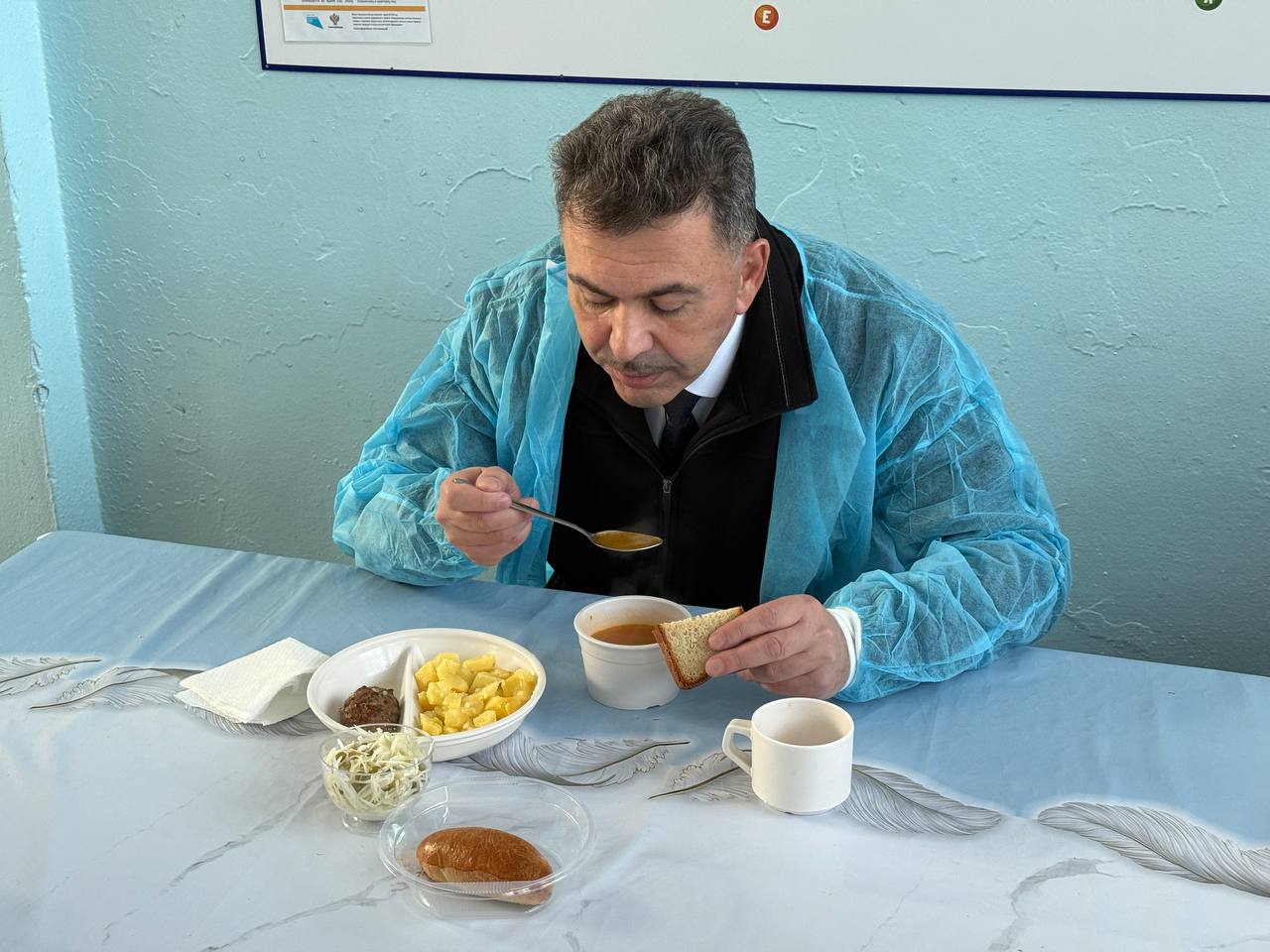 Евгений Витальевич не смог устоять перед настойчивой просьбой встречающих попробовать блюда, и остался доволен вкусовыми качествами.