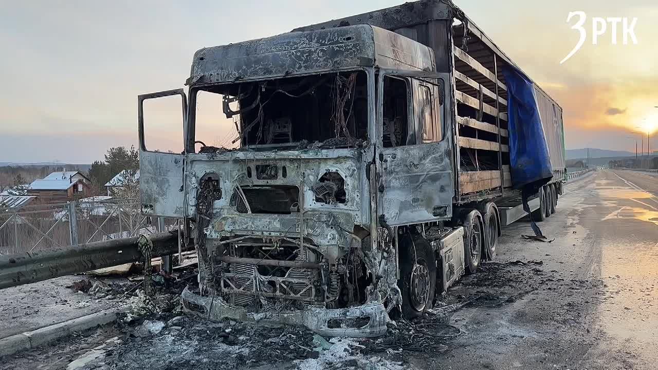 Все, что осталось от фуры. Напомним, вчера вечером напротив кафе «Баян Зочин» в Угдане загорелась фура