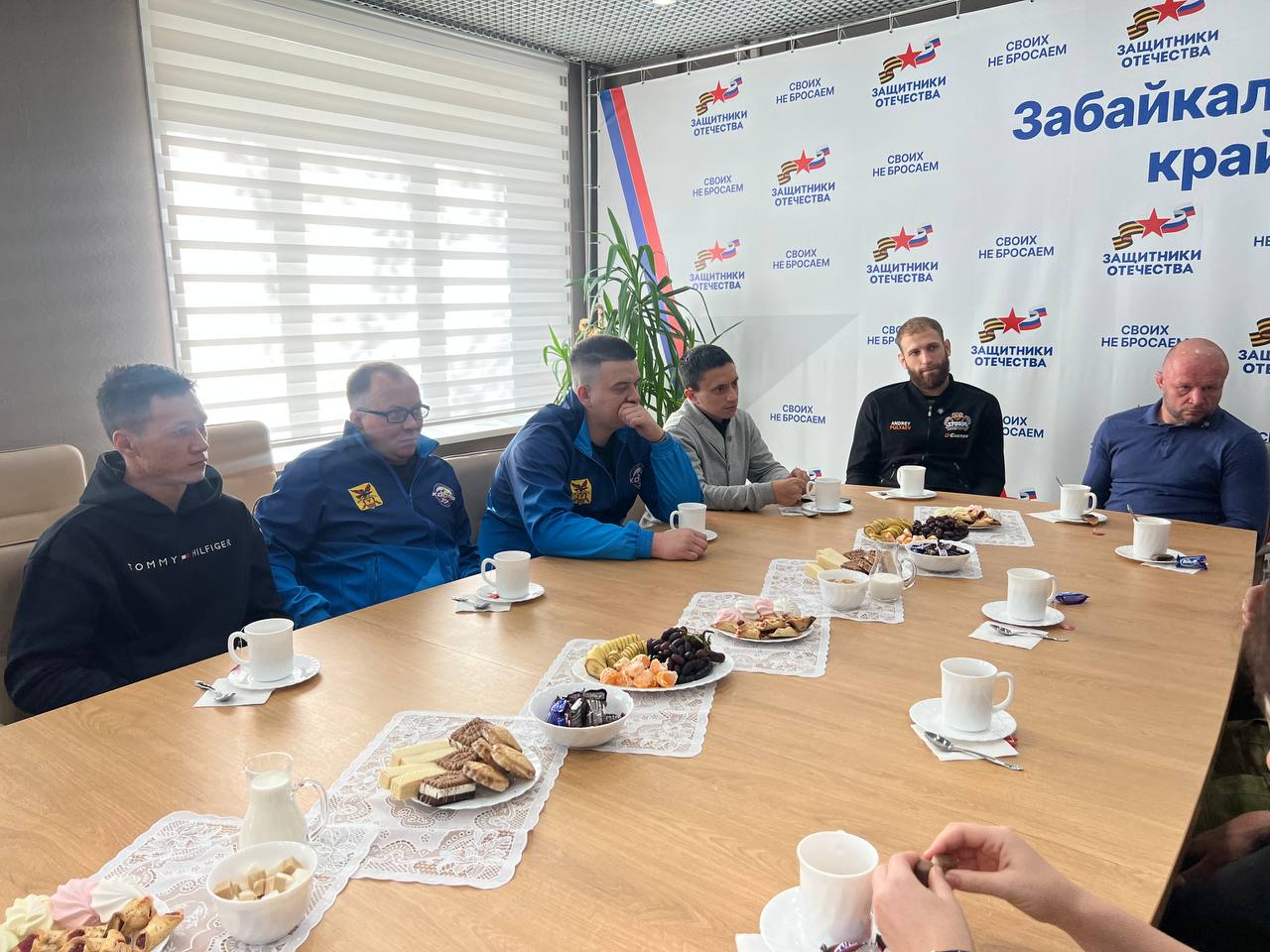 В Чите 1 октября в фонде «Защитники Отечества» прошла встреча с лучшими бойцами Андреем Пуляевым и Александром Шлеменко. На встрече бойцы поделились своим успехом, рассказали о трудностях, с которыми столкнулись на пути к вершинам спортивного Олимпа, и о том, как преодолевали их. Андрей Пуляев подчеркнул важность поддержки со стороны тренеров в начале своей карьеры: