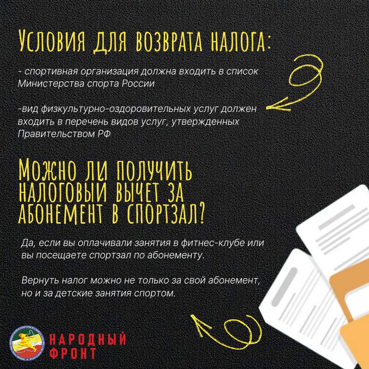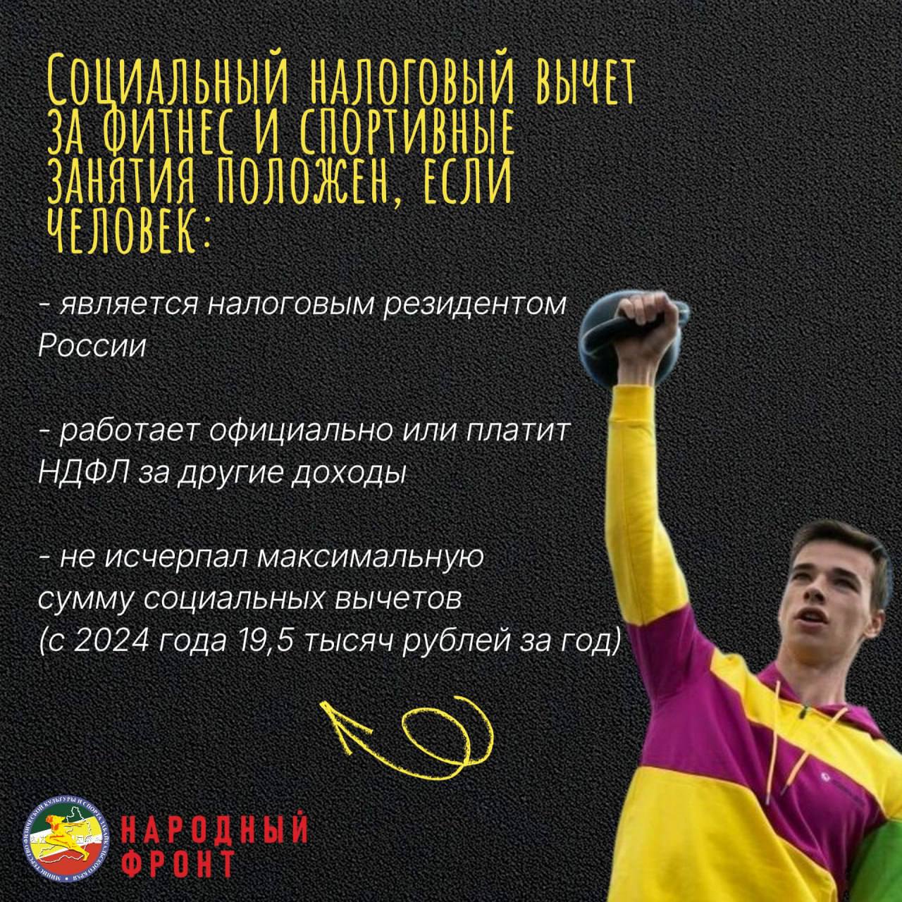 С 2022 года в рамках проекта «Спорт – норма жизни» вы можете получить социальный налоговый вычет за физкультурно-оздоровительные услуги! Это значит, что занятия спортом могут не только улучшить ваше самочувствие, но и помочь сэкономить на налогах.